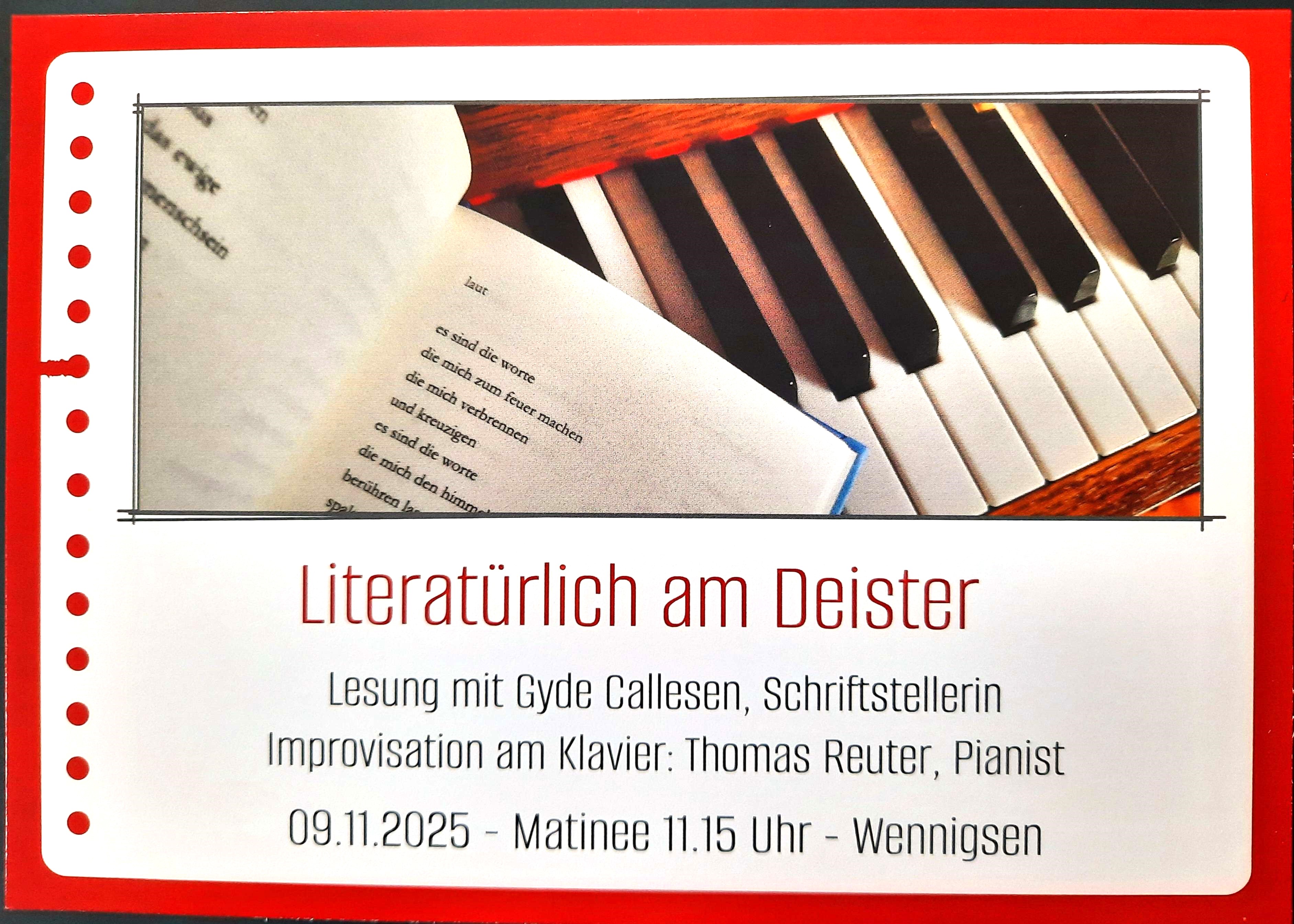 Beglückend war für uns eine Konzertlesung, die wir gemeinsam mit dem Geisteswissenschaftler und Buchautor Laszlo Böszörmenyi gestalten durften - allerdings eben leider ohne Andreas: DIE FREUDE IST DIE LUFT DER NEUEN WELT. Ein Abend mit Worten von Gitta Mallasz, Rudolf Steiner und Georg Kühlewind. Laszlo gab eine Einführung und sprach dann die inspirierenden Texte im Wechsel und in Verflechtungen mit frei improvisierter Musik von uns beiden: Stimme und Klavier (letzteres teils "präpariert"). - Für das Ganze kann hier ein Satz von Laszlo Böszörmenyi stehen: "Die Freude ist eine Urkraft, die schon bei der Schöpfung mitgewirkt hat, und die auch heute jeden schöpferischen Akt begleitet."