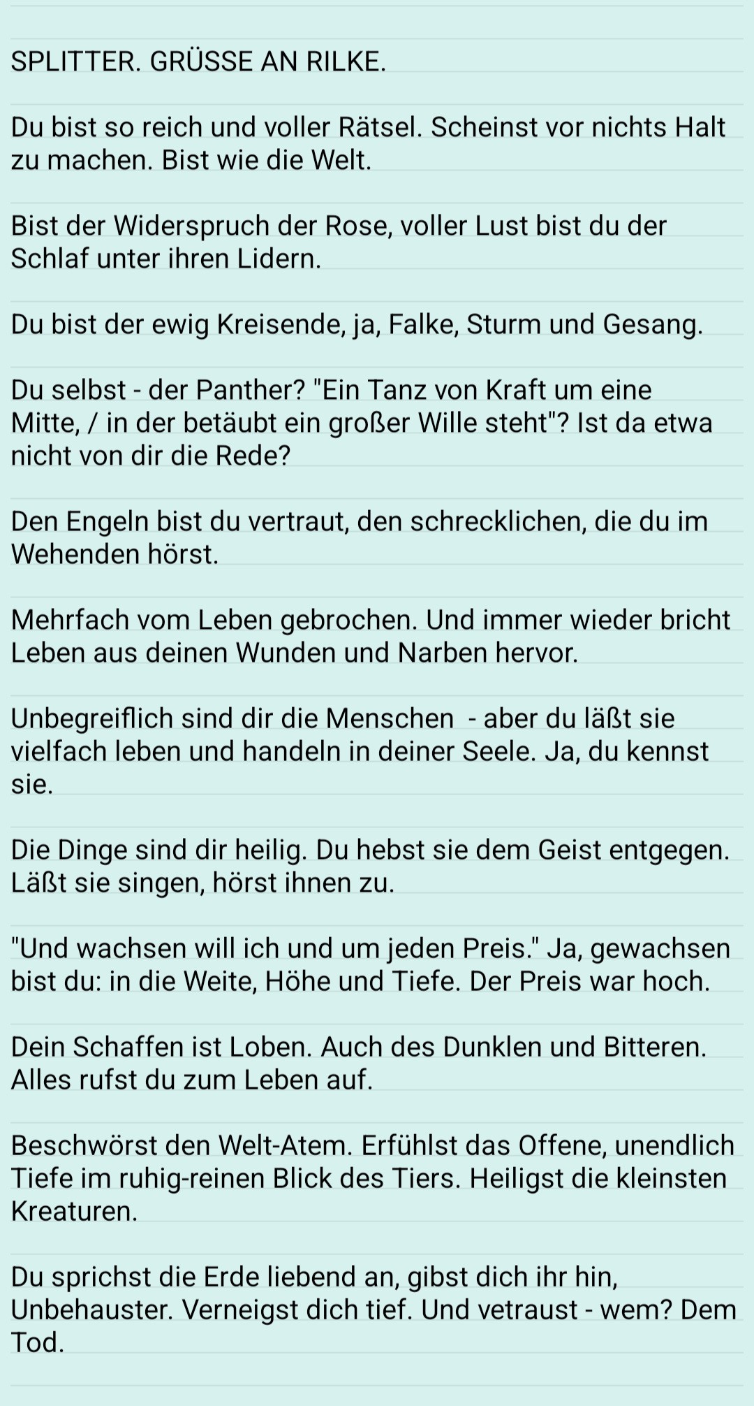 Meine große, fast übergroße Liebe war und ist ja CELAN, aber seit kurzem hab ich mich wieder mit RILKE beschäftigt! Ich hatte zeitweise intensiv mit ihm zu tun, habe unter anderem Klavier-Improvisationen zu sämtlichen Duineser Elegien gemacht, war aber immer wieder voller Respekt vor diesem Giganten, dessen Sprache ich zumindest teilweise nicht "verstehen" konnte. Jetzt merke ich, daß ich die Gedichte nicht bloß lesen, auch nicht bloß anhören sollte; ich versuche sie selbst zu sprechen: teils zunächst ganz langsam, jedes Wort auf der Zunge spürend! So bereite ich für den Herbst einen Rilke-Abend in Hannover vor.